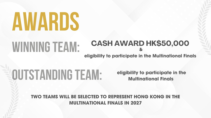 The Winning Team will receive a generous cash award of HK$50,000 explicitly designated to facilitate the ongoing enhancement and refinement of their project. Additionally, the Winning Team and an Outstanding Team selected by the judging panel will have the opportunity to participate in the Multinational Finals in 2027.